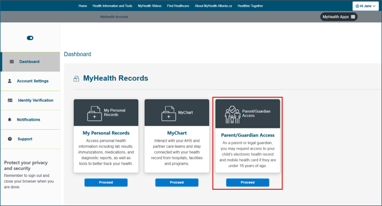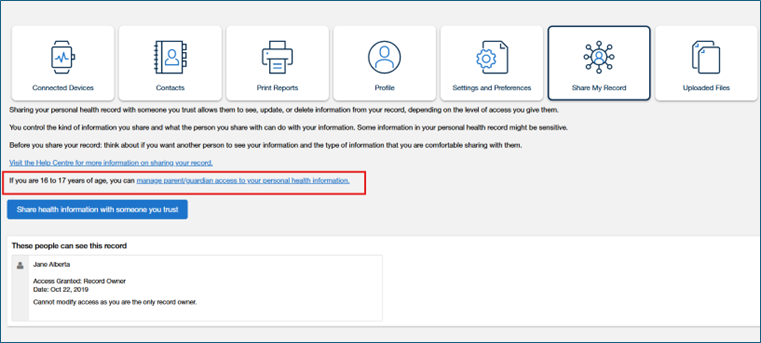 If you are 14 years of age or older with your own MyHealth Records account, you can choose to share your personal health information with a parent/guardian, or anyone you trust using the ‘Share My Record’ feature.
