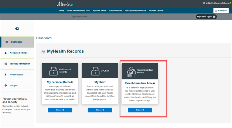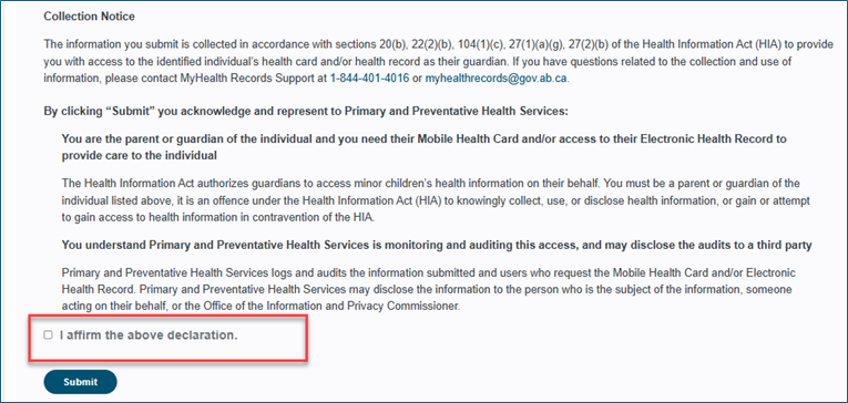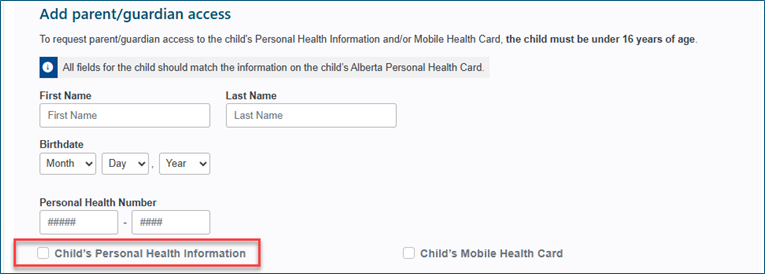 Parents/guardians can access their child’s personal health information and/or Mobile Health Card. Access can change over time as children get older. Parent/Guardian access ends automatically when a child turns 18.