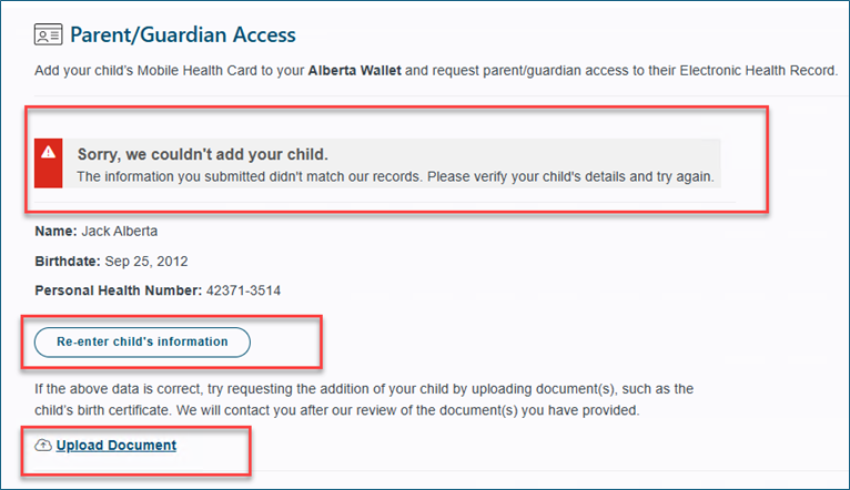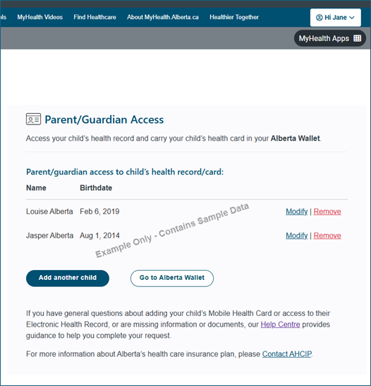 Parent/Guardian access to the child’s personal health information and/or Mobile Health Card is granted after completing the steps above.