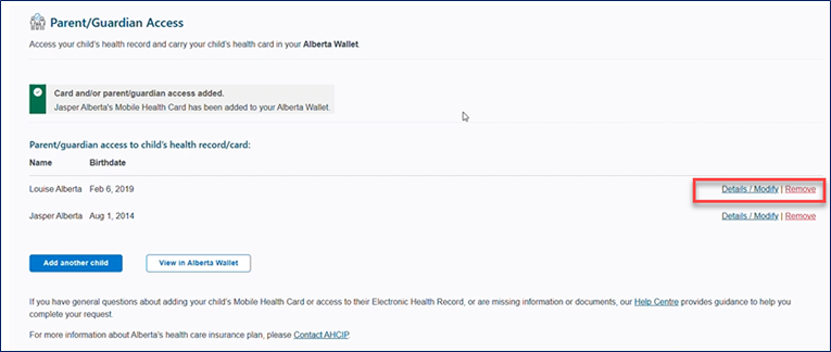 - Parents/Guardians can remove their own access to their child’s personal health information and/or Mobile Health Card