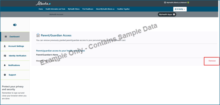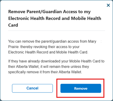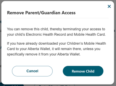 Parents/Guardians can remove their own access to their child’s personal health information and/or Mobile Health Card.
