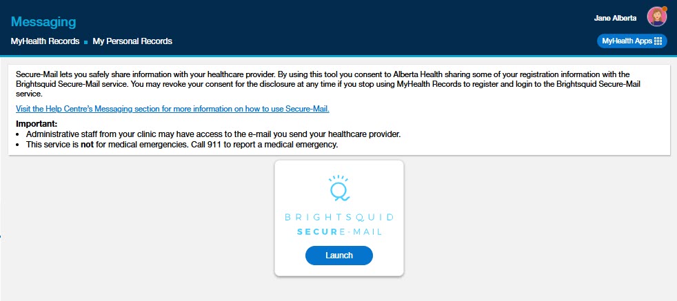 Click the blue “Launch” button. Please note that when you launch Secure-Mail, you are taken out of MyHealth Records. Remember to sign out of Secure-Mail and MyHealth Records, and close your browser when you are done.